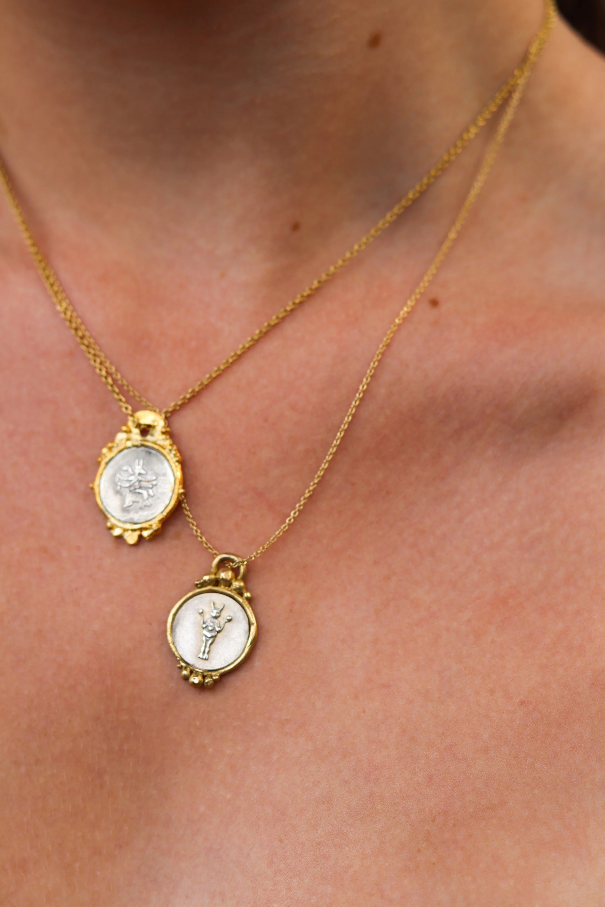 Made from sterling silver, 18ct yellow gold and resting on a 9ct yellow gold chain, this necklace depicts Madam Mojo. In one hand she holds a tiny globe, a symbol of her guardianship over earth and the human world. In the other hand she holds the egg, a divine symbol of life.